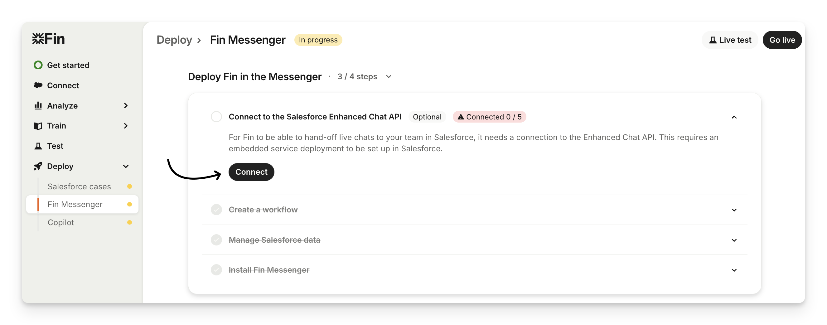 To set this up, go to Deploy > Sweo Messenger > Connect to the Salesforce Enhanced Chat API and click Connect.