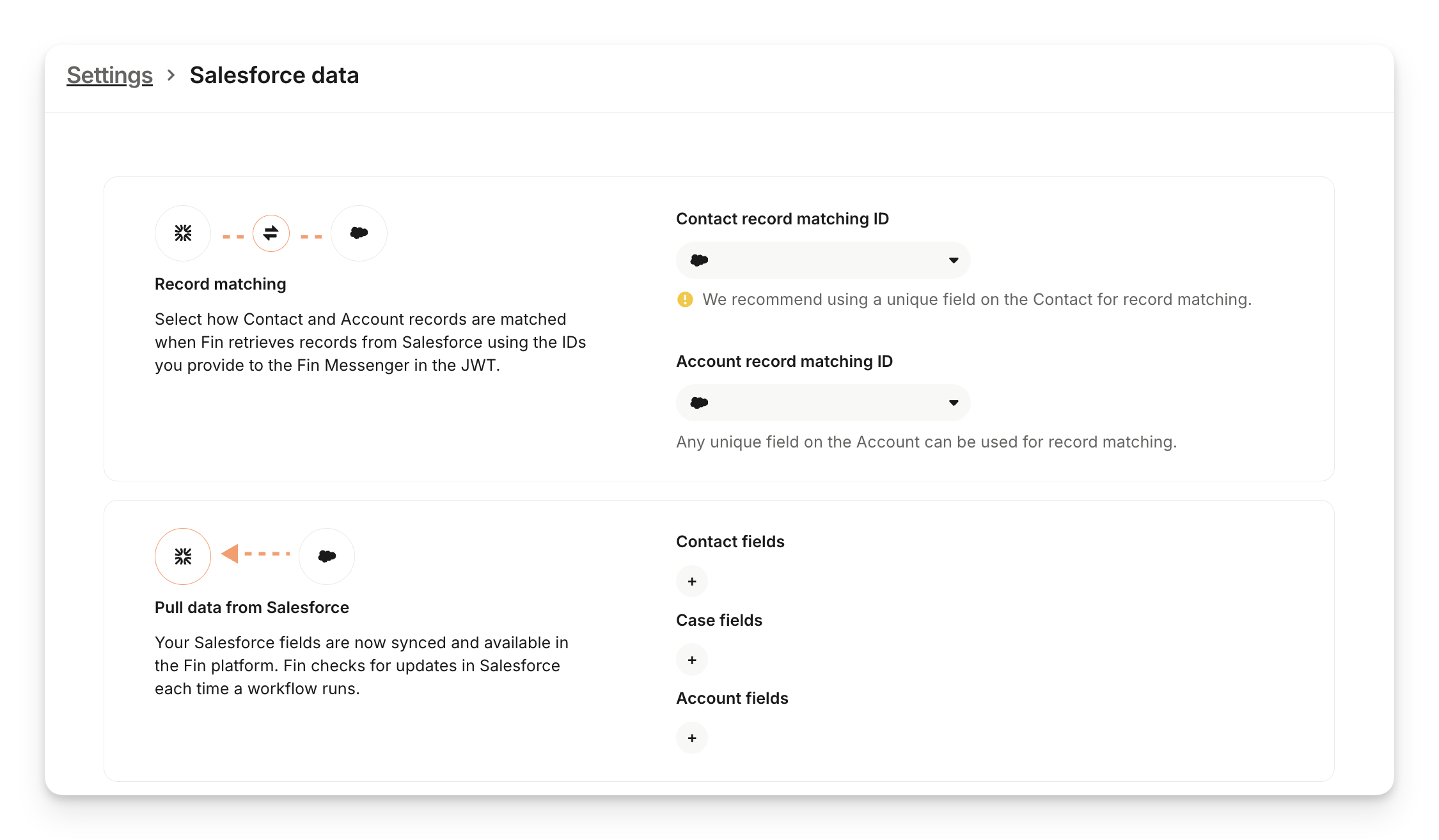 Record matching: Select how Contact and Account records are matched when Sweo retrieves records from Salesforce using the IDs you provide to the Sweo Messenger in the JWT.