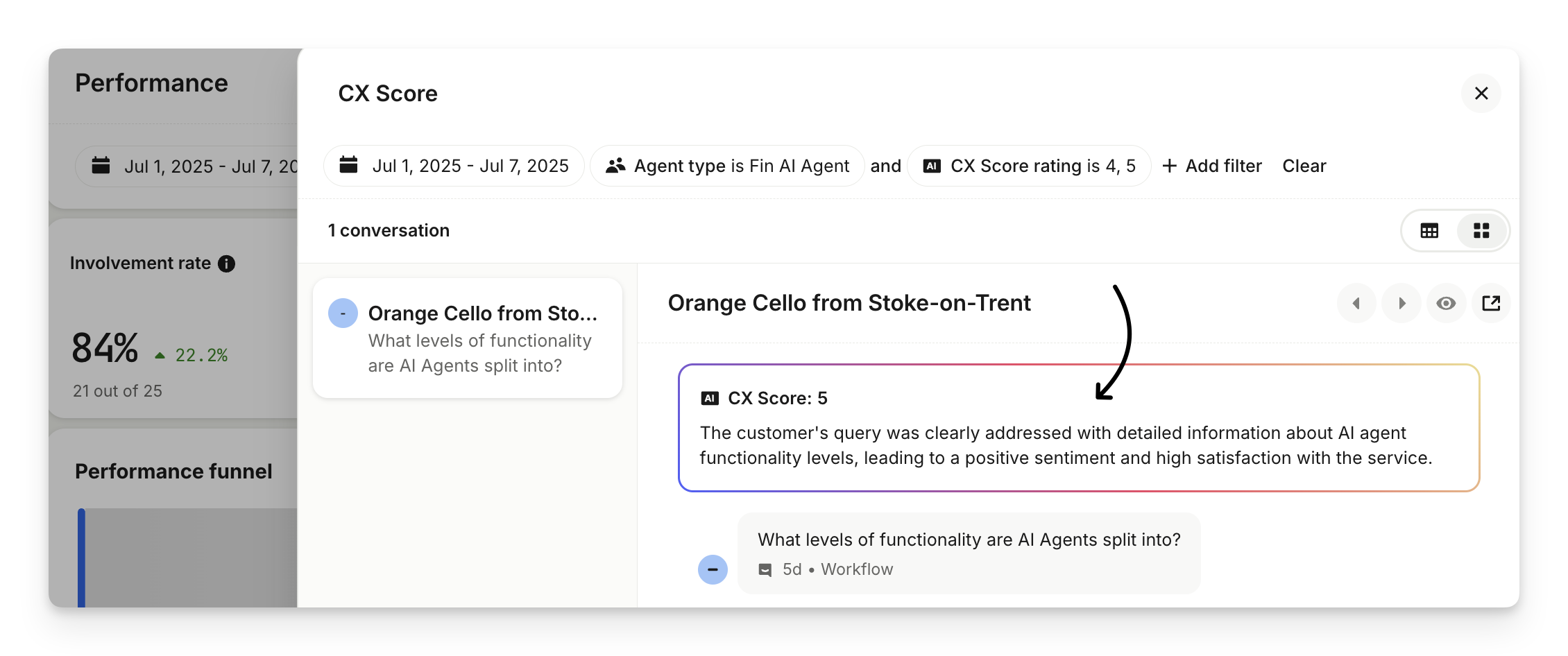 This score reflects how satisfied customers are with Sweo's service. Click Drill-in to view the conversations behind Sweo’s CX Score, along with a summary that highlights key moments and explains why each score was given.