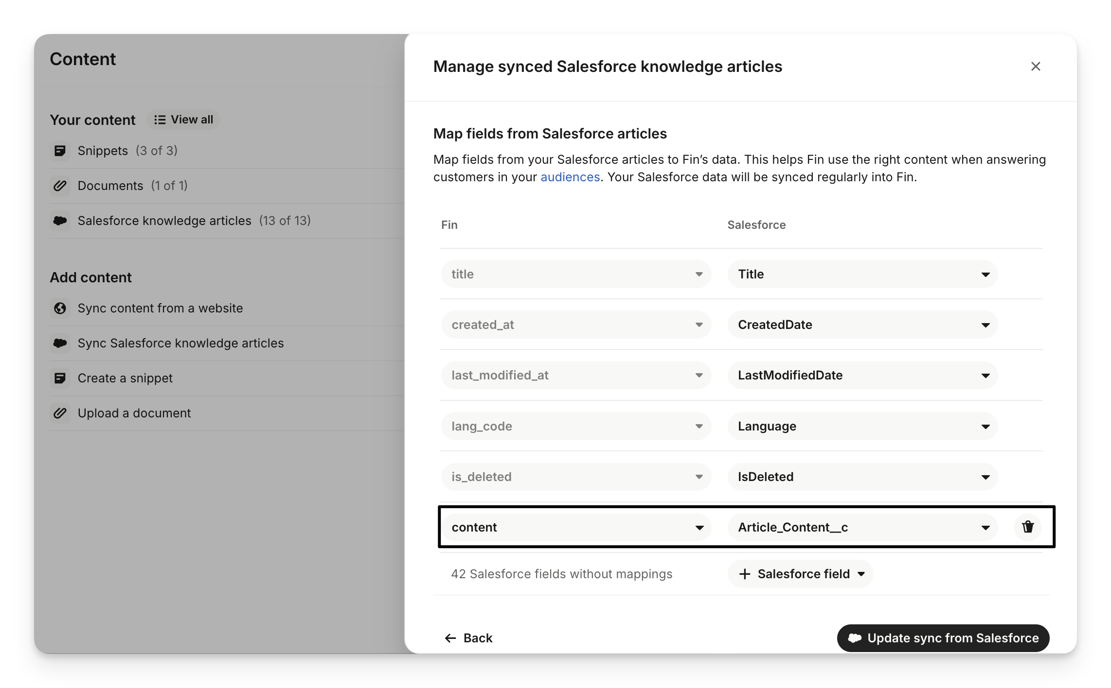 Here, add a new Salesforce field and select the corresponding field for your Salesforce articles, then map it to the content field for Sweo. When you're finished, click Update sync from Salesforce.