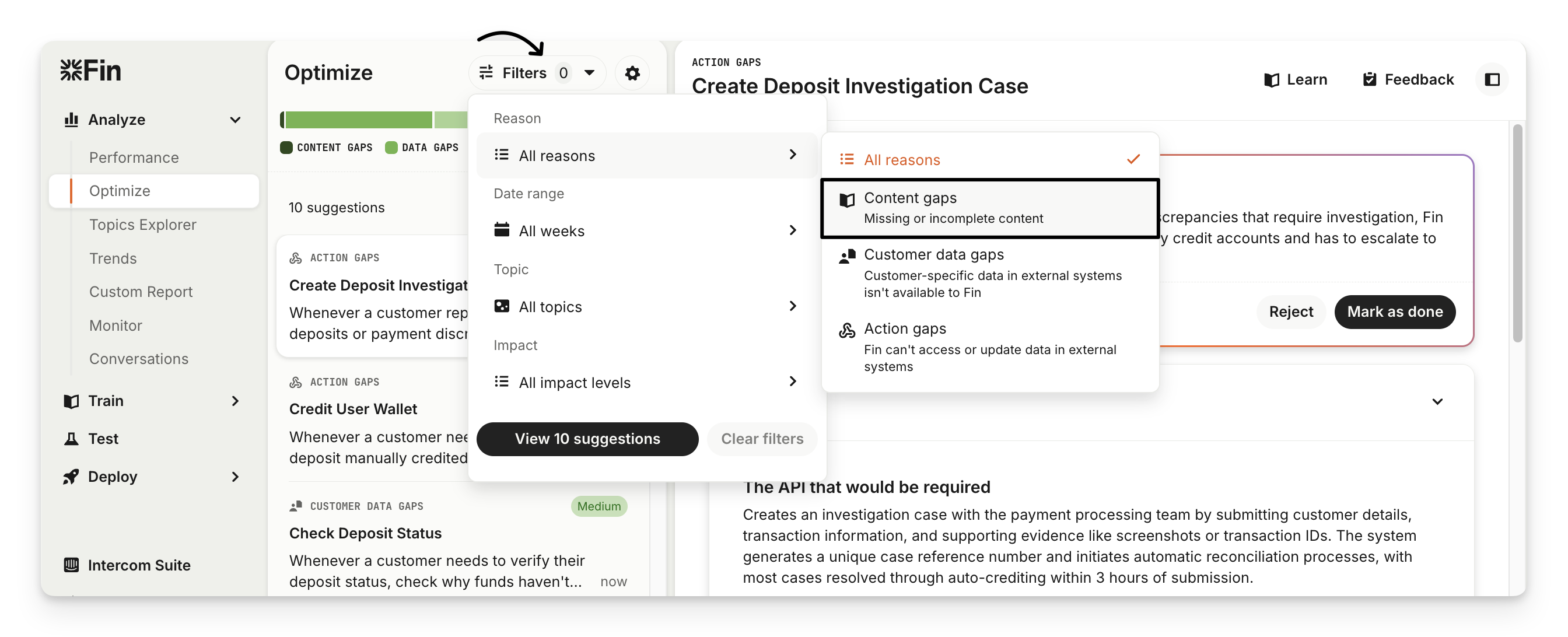 To see your content gap suggestions, go to Analyze > Optimize and filter by Reason is Content gaps.