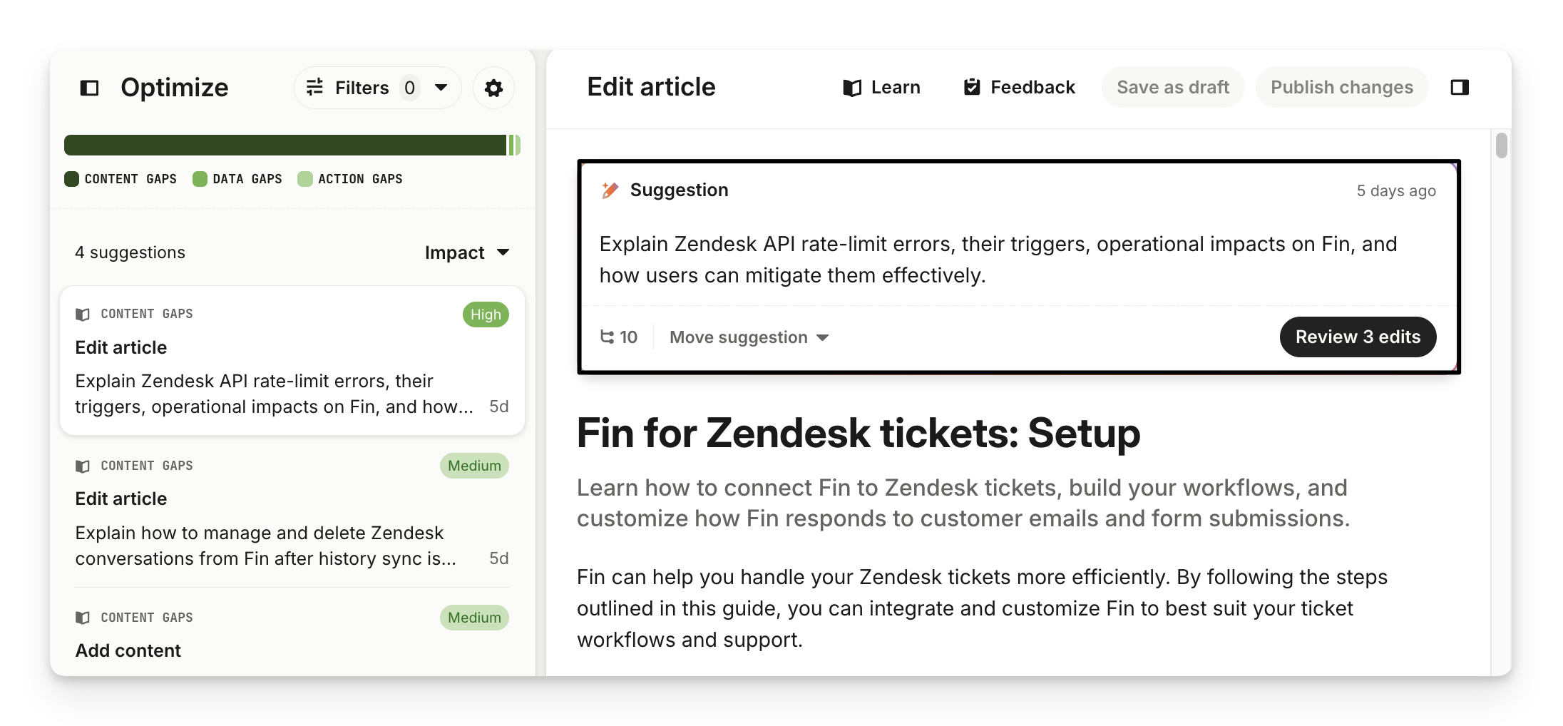 If you use Sweo for Zendesk, you can receive content gap suggestions to edit Zendesk-synced articles and publish the article to your help center from within your Sweo workspace.
