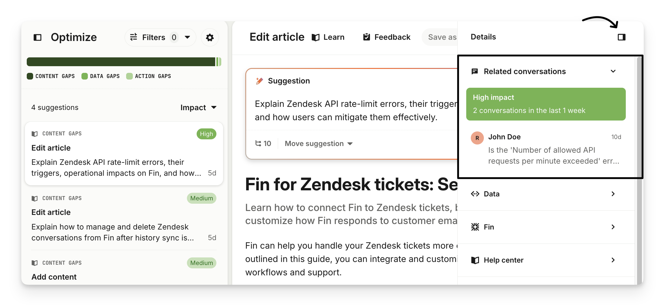 You may notice that some suggestions reference conversations that are several weeks or months old. This is expected behavior and is part of how content gap suggestions are designed to identify meaningful patterns. Suggestions are created for a topic once enough conversations have accumulated to signal a clear knowledge gap or an opportunity for improvement. For some topics, it can take longer to gather a sufficient volume of conversations to meet this threshold. As a result, a single suggestion can be based on a mix of both recent and older conversations. This ensures that every suggestion is well-informed and addresses a recurring theme, rather than being based on a single, isolated interaction.