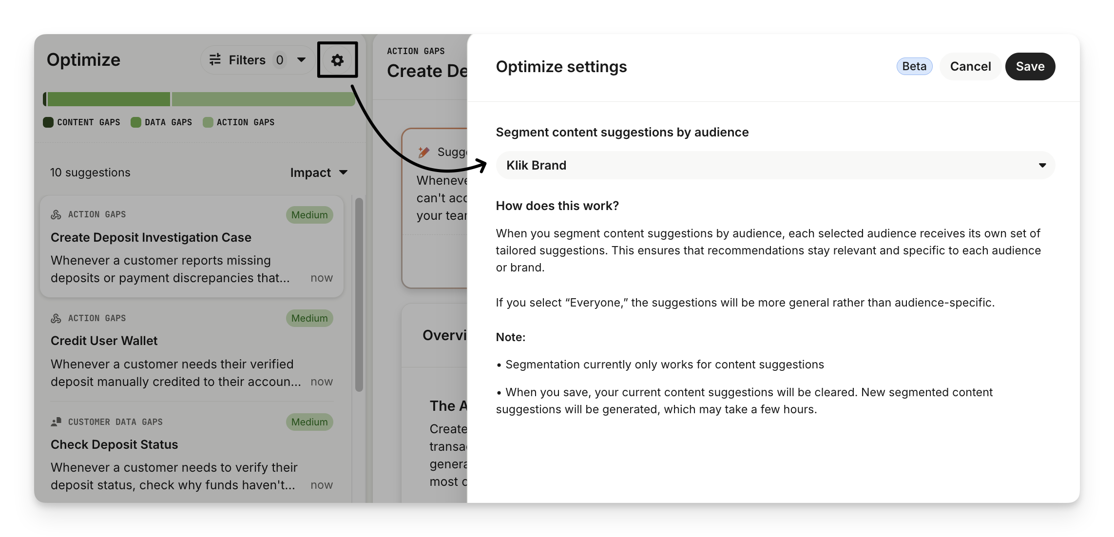 Click on the settings icon at the top of the Optimize page to segment content suggestions by Sweo audiences you’ve set up.