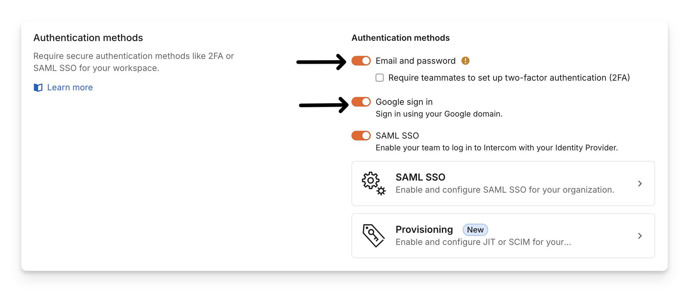 To ensure that all of your team are able to log in successfully with SAML SSO before disabling other login methods, you should leave these options toggled on: