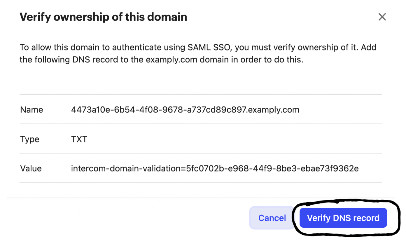Note: If you have just created the DNS record it may still be propagating, in this case you’ll see the following warning message: “Unable to verify DNS record. Please try again later.”