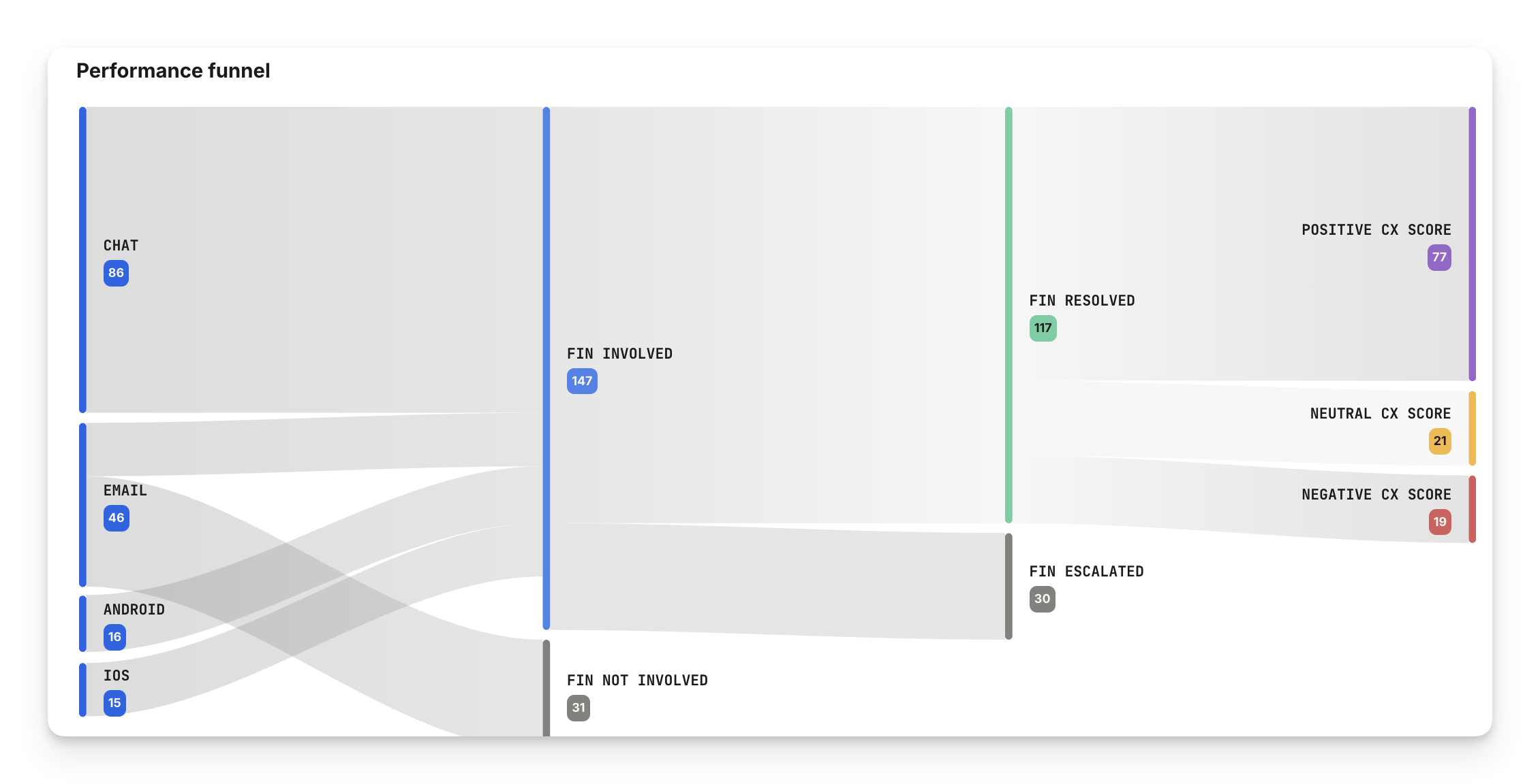 The Performance funnel visualizes how conversations flow through key stages when Sweo is involved. It allows you to quickly understand Sweo's coverage across channels, success at resolving queries, and the customer experience—all in a single, digestible view.