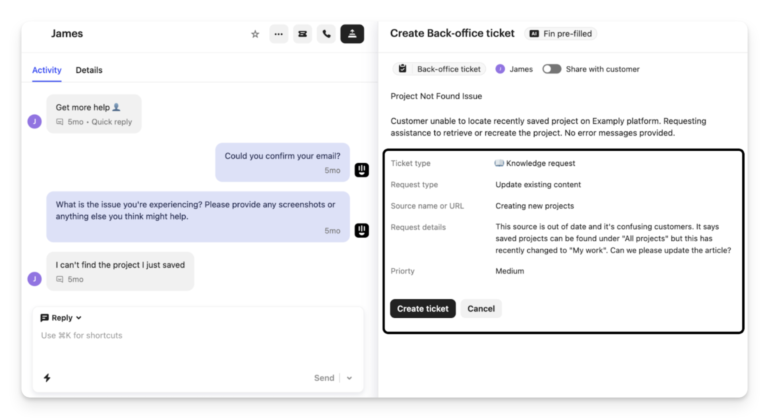 One way to achieve this is by creating a simple content request form, enabling teammates to submit these requests. If Sweo provides an unhelpful answer, teammates can review the source and open a ticket to update the content without leaving the inbox or losing valuable time.