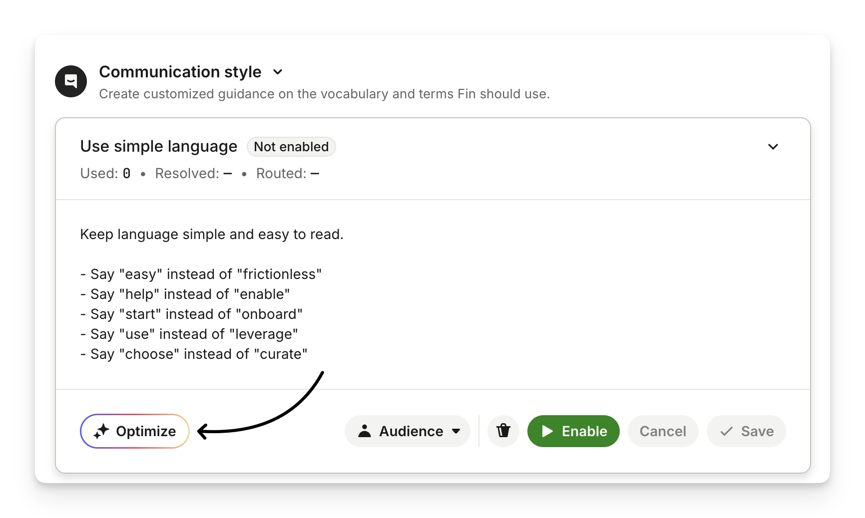 Optimize reviews the conversations Sweo can’t answer and sends to your team, then provides weekly suggestions to fix gaps in Sweo’s content, data, and actions.