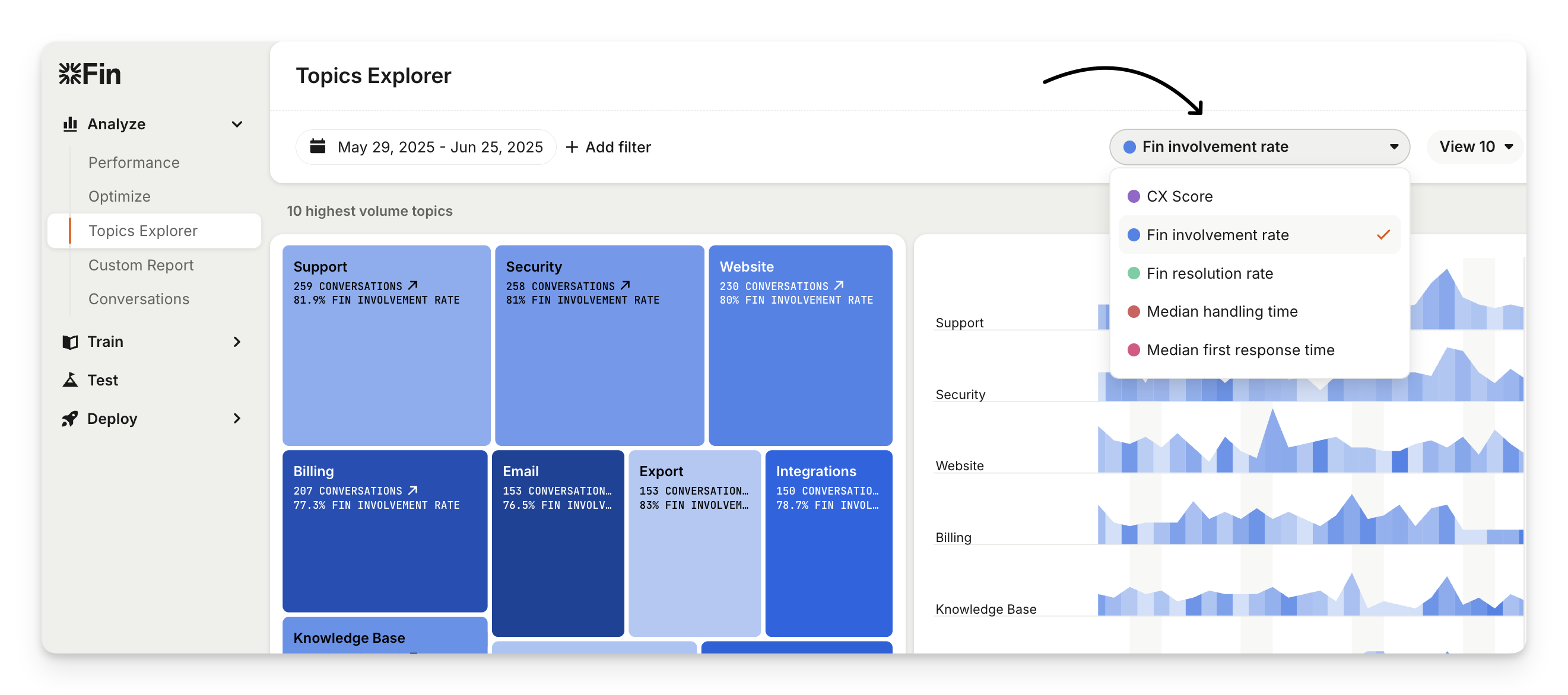 You can boost involvement rate by getting Sweo involved in more conversations. Visit the Topics Explorer and select Sweo involvement rate to see AI automatically group your support conversations into topics and subtopics. This highlights specific topics where Sweo's involvement is the weakest and needs improvement.