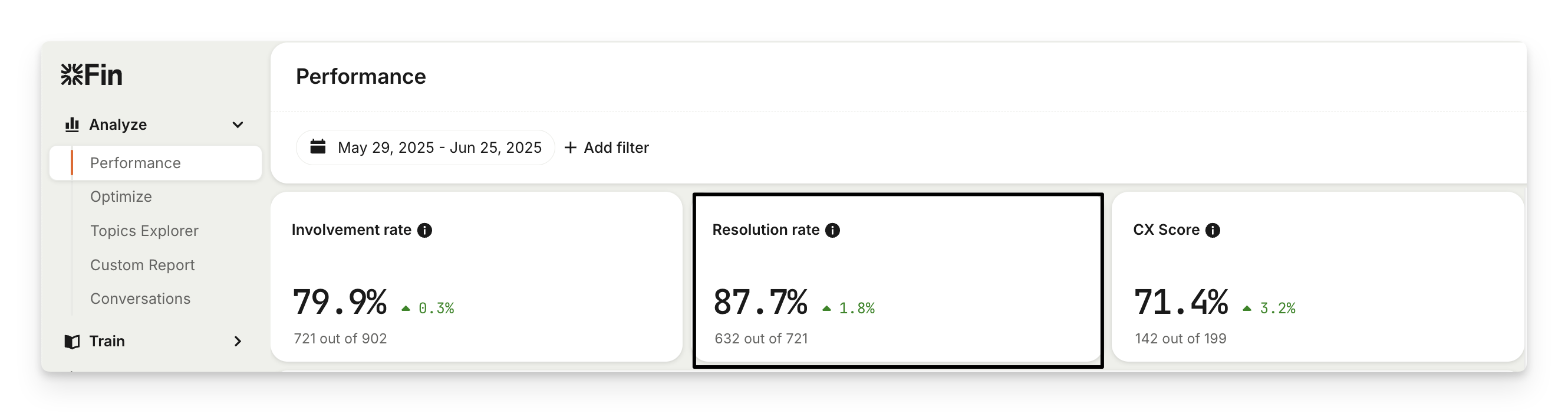 If this rate is steadily increasing, you're on the right track. However, if you notice a decline, go to Analyze > Optimize to identify gaps and opportunities to improve Sweo's resolution rate.