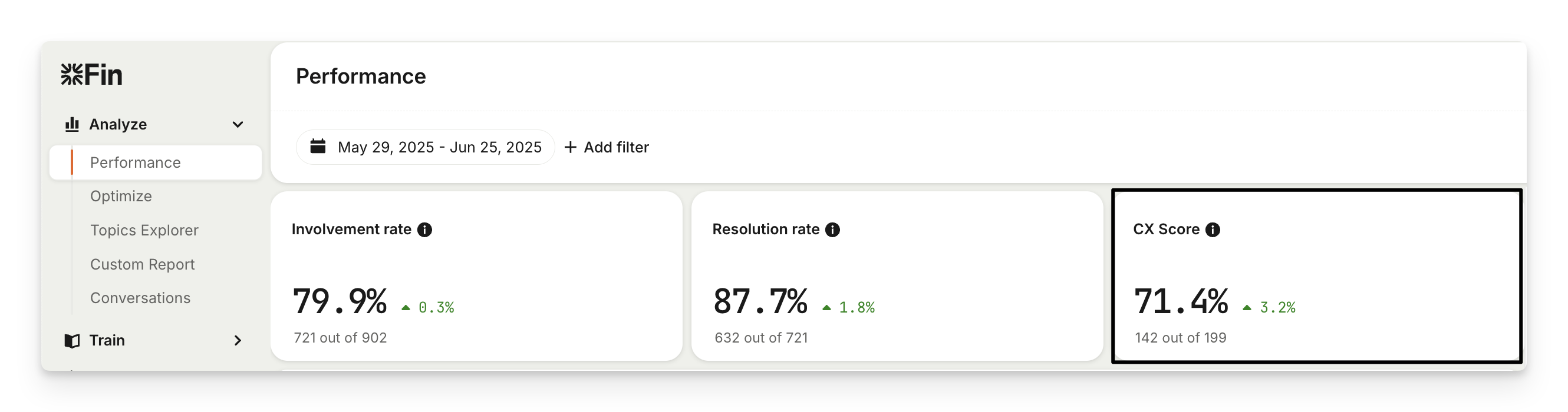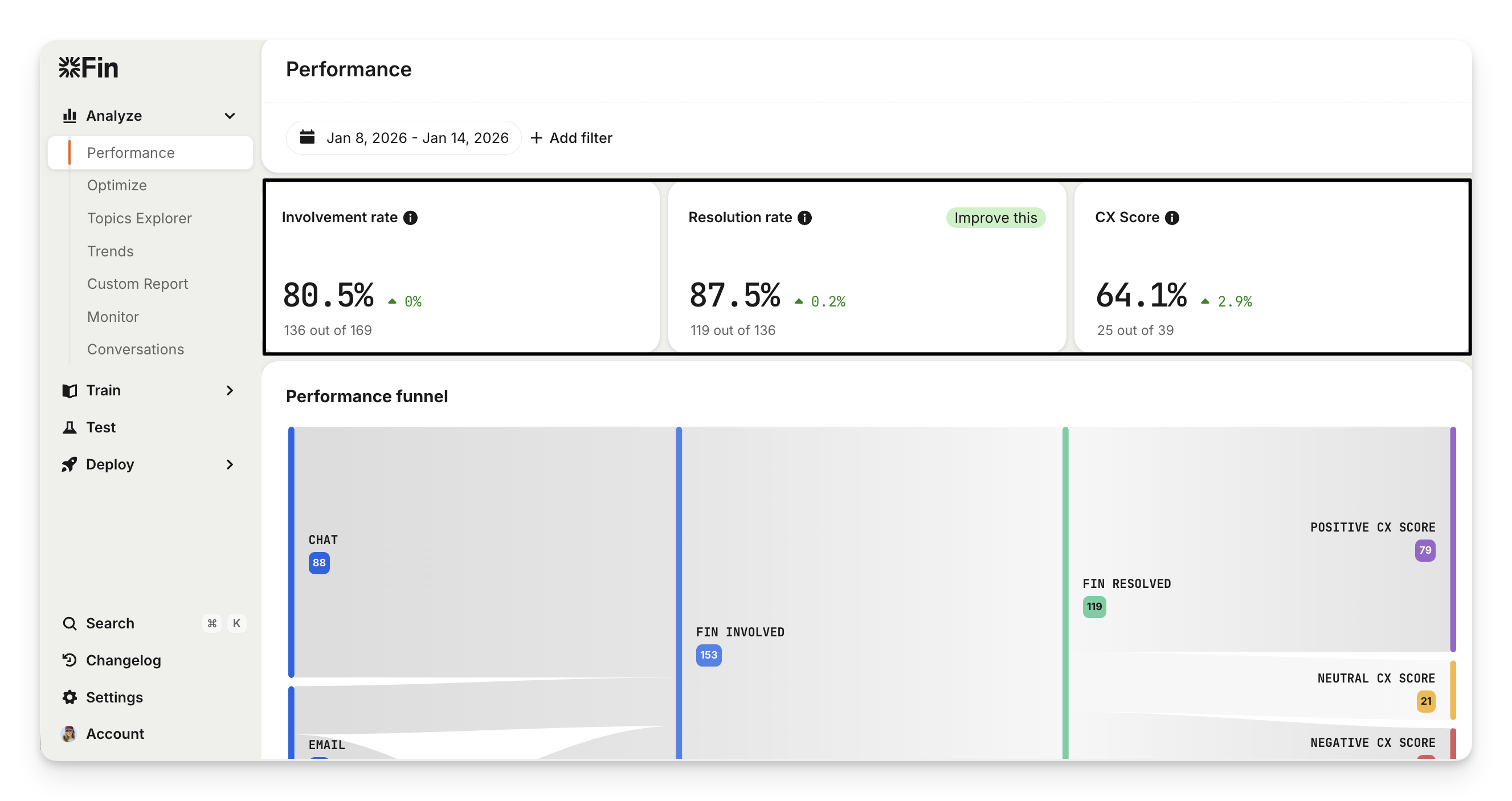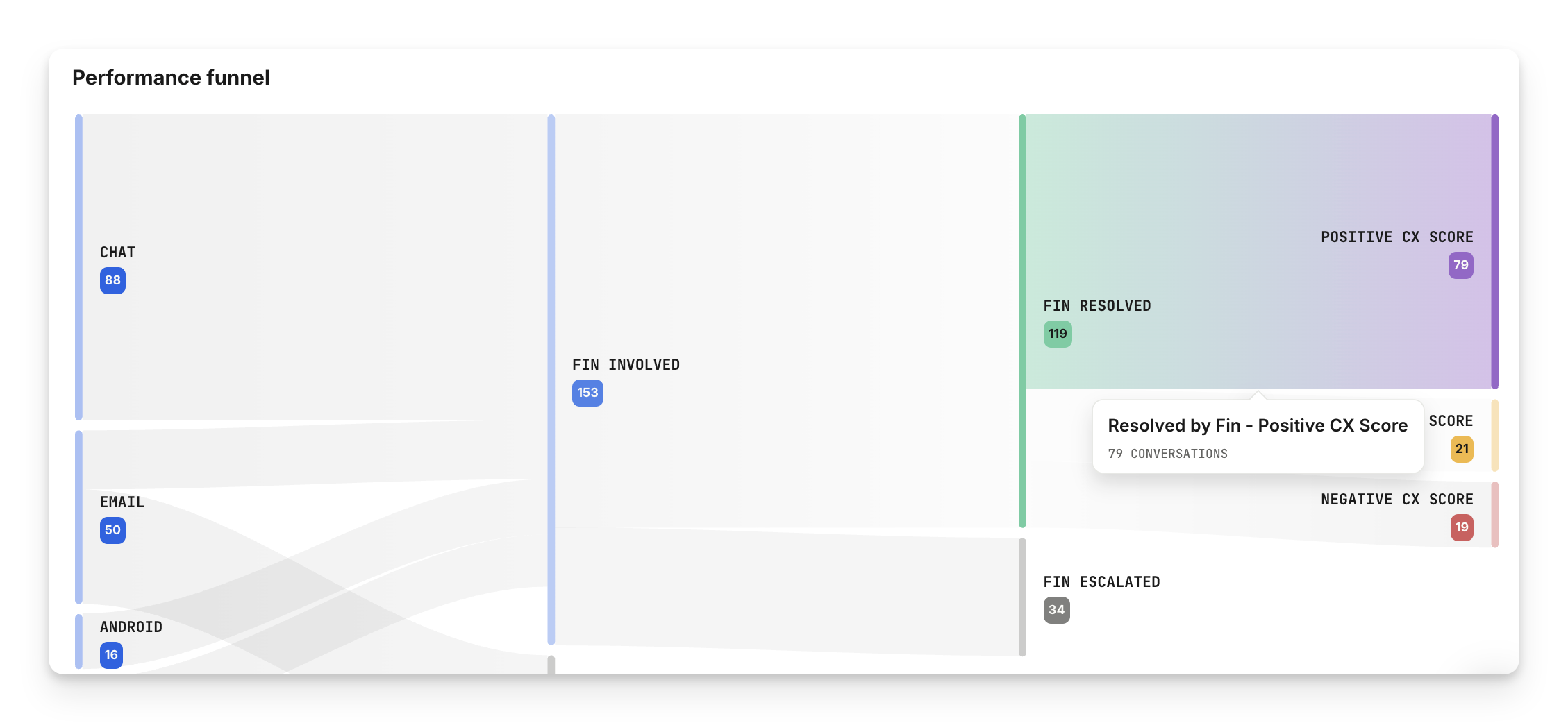 Get a CX Score analysis by going to Analyze > Performance and view Sweo resolved conversations in the Performance funnel. This breaks conversations down into: