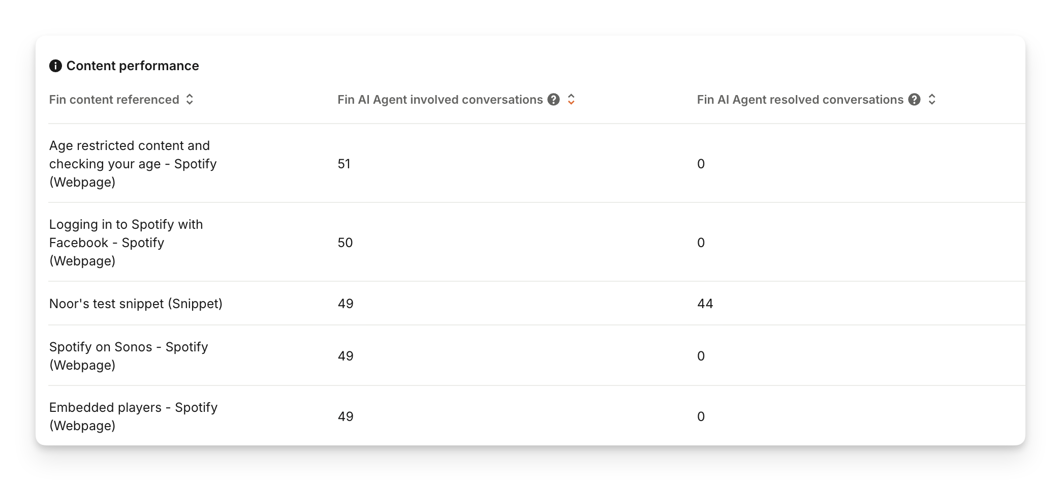 Sort by Sweo AI Agent involved conversations to identify the content referenced most frequently. If the number in the Sweo AI Agent resolved conversations column is significantly lower for a piece of content, it means the information Sweo is using is not providing satisfactory answers to customers.