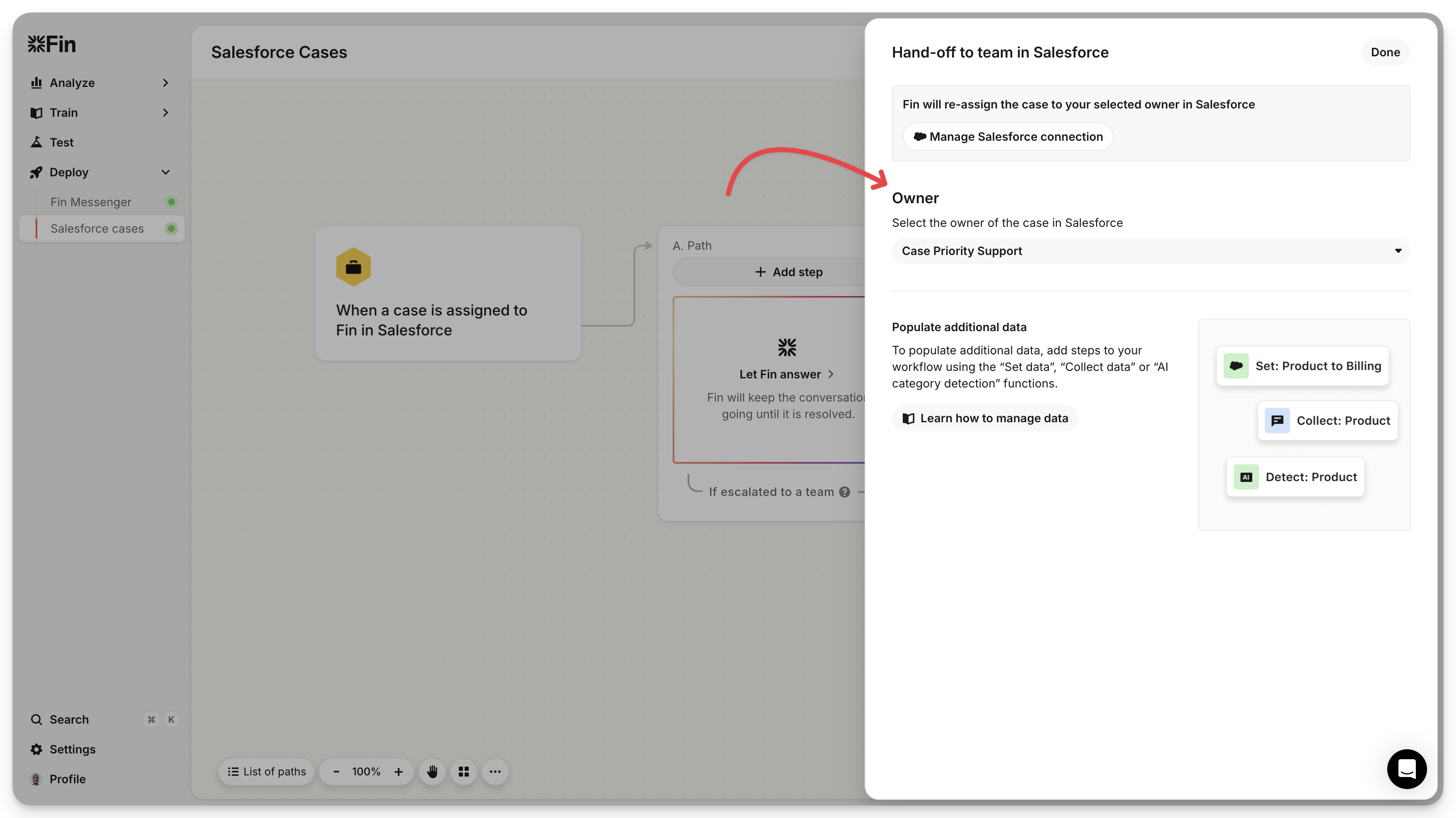 When Sweo can't answer, you can use "Hand-off to team in Salesforce" in your workflow. This enables Sweo to re-assign the case to your selected owner in Salesforce.
