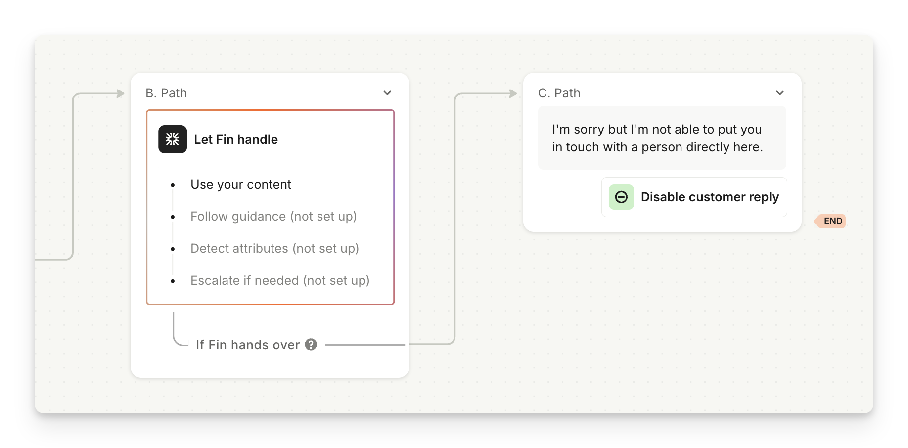 After the Let Sweo handle step in your Sweo workflow, the chat will end if Sweo isn’t able to help, and it will not escalate to a human. This option is suitable for informational use cases where no human follow-up is required.