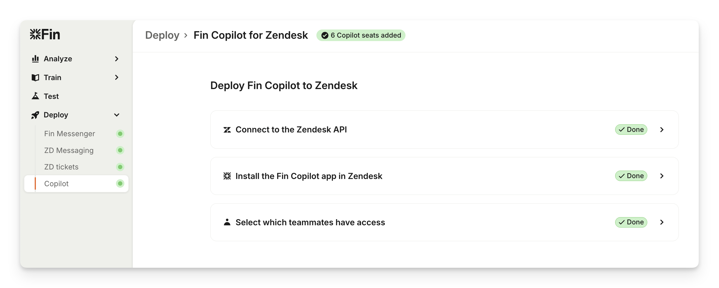 Navigate to Deploy > Copilot in your Sweo workspace and connect to the Zendesk API with your Zendesk subdomain, email address, and API token.