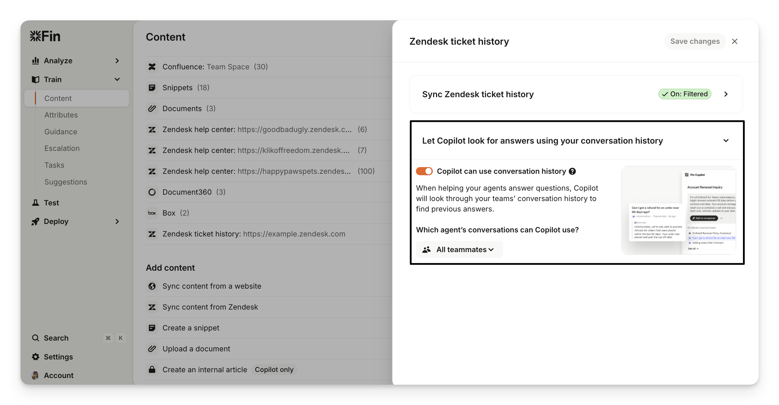 From the Train > Content section, you can also select Zendesk ticket history and enable the toggle to sync history.