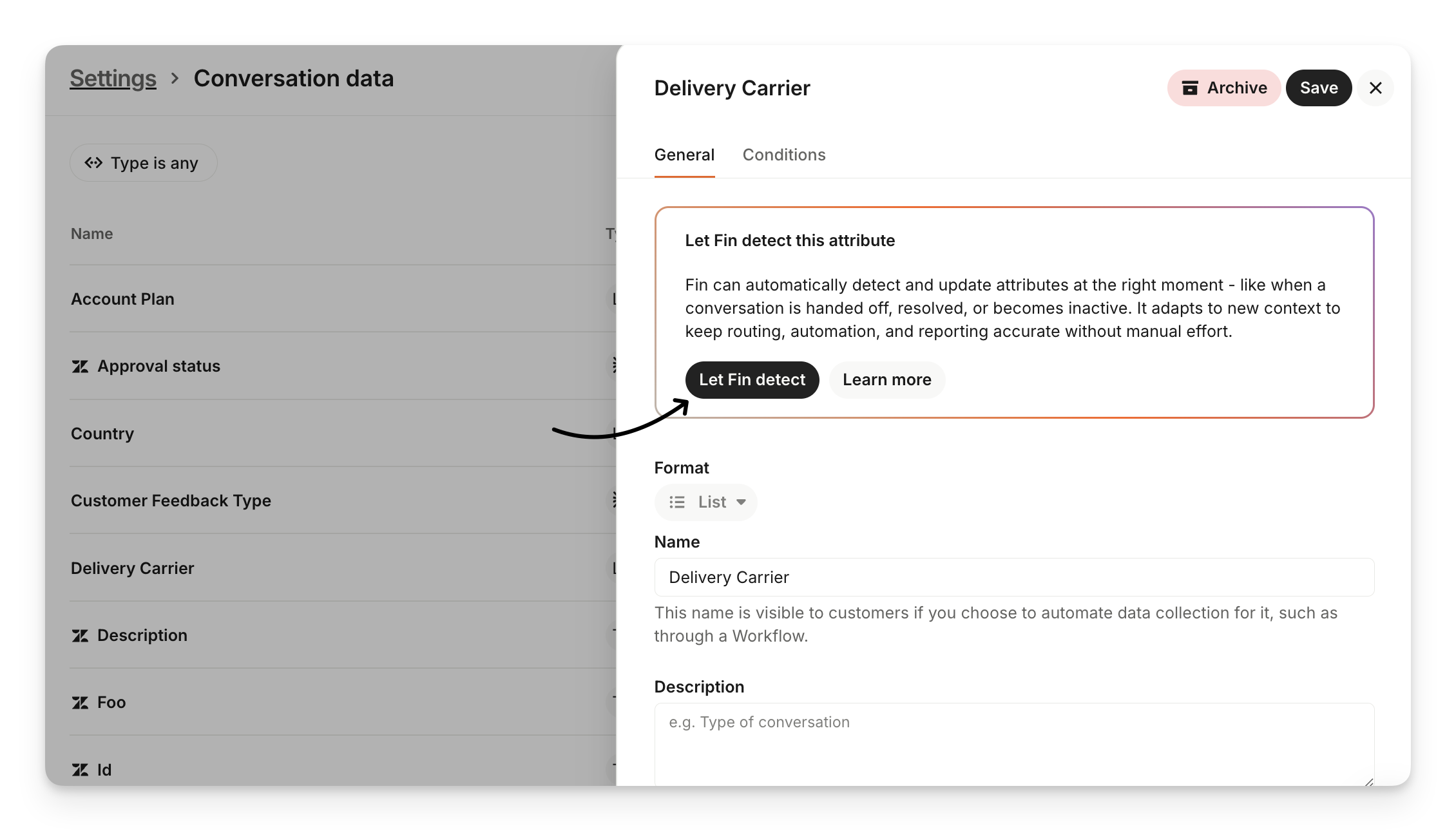 Go to Settings > Conversation data, click edit on a list-type attribute, and then click Let Sweo detect.