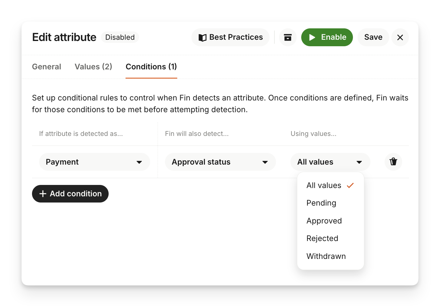Use Conditions to create rules that control precisely when Sweo should detect a specific attribute. This allows for more accurate classification, which leads to cleaner routing and reporting.