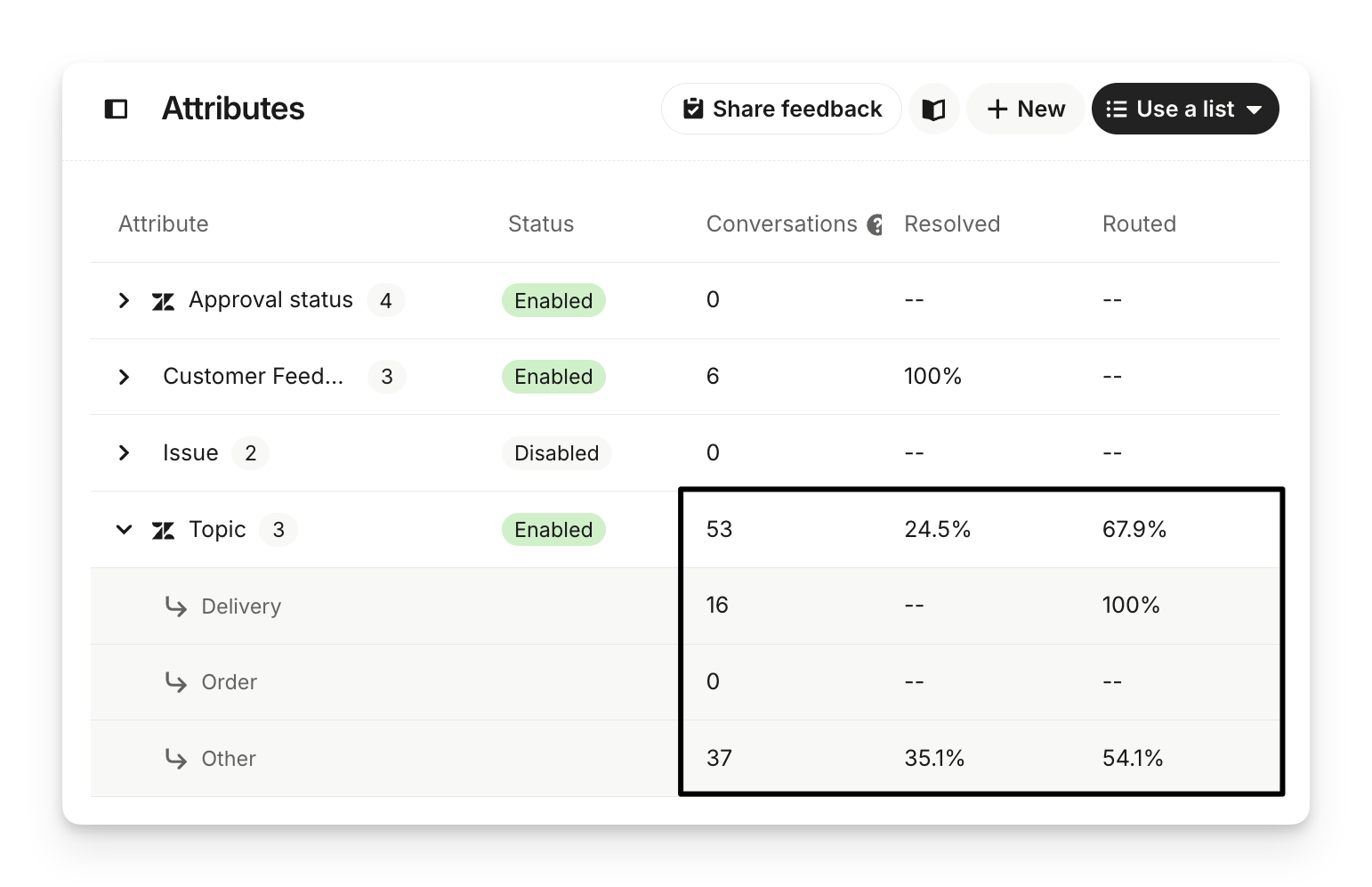 Routed → the percentage of conversations successfully routed using that attribute.