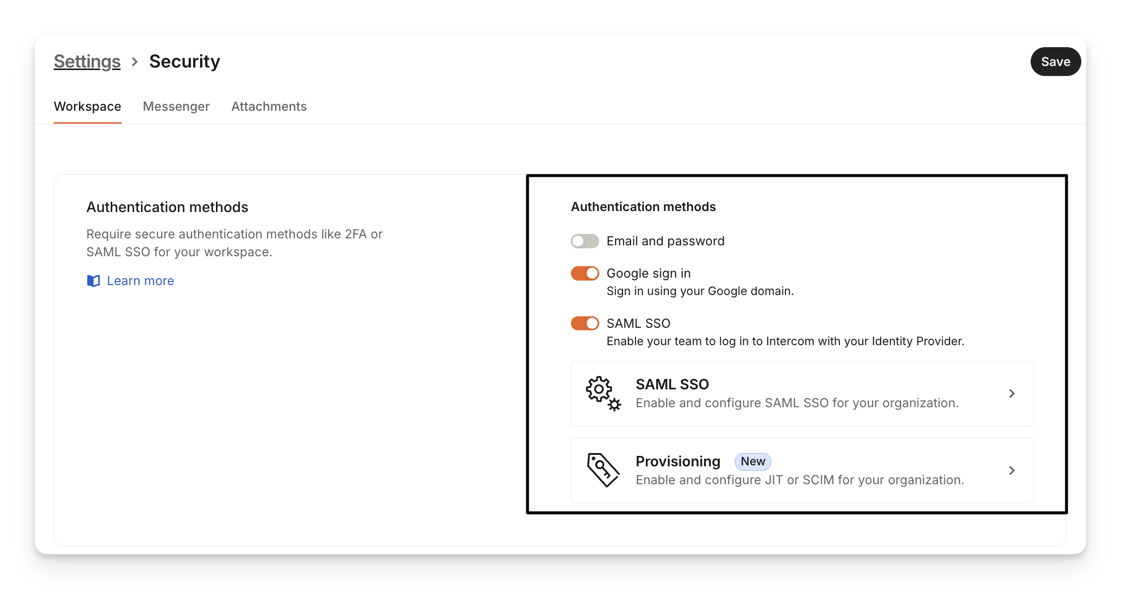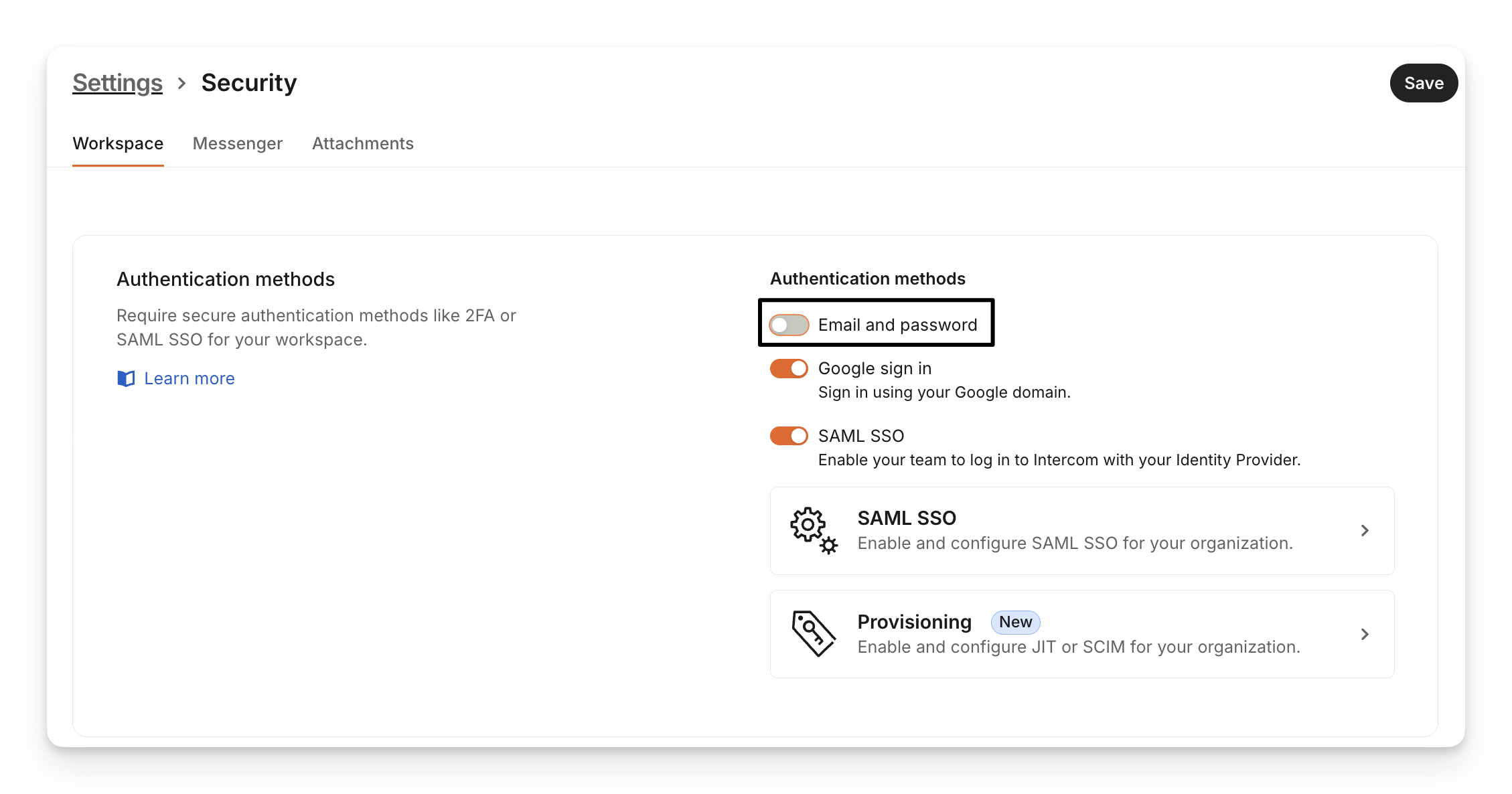 Go to Settings > Security > Workspace and choose the option you’d prefer under "Authentication methods".