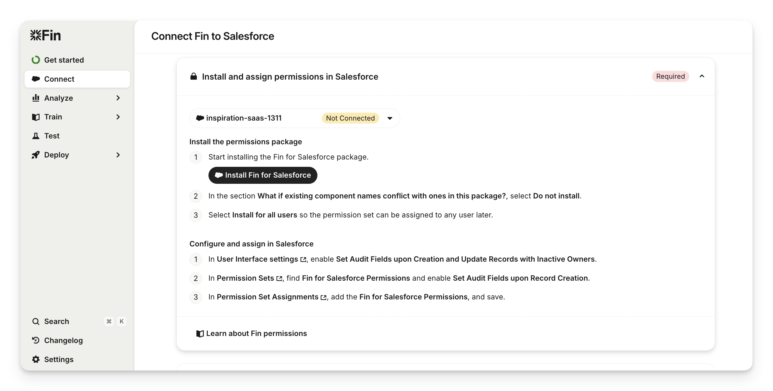 Navigate to Connect in your Sweo workspace and open Install and assign permissions in Salesforce.
