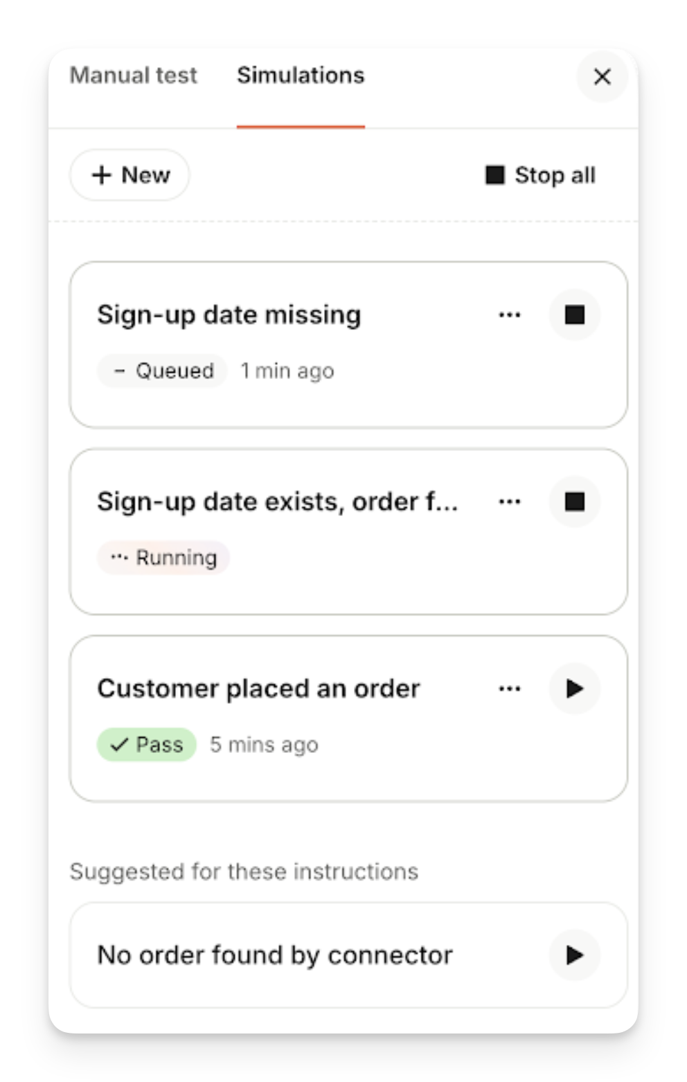 Designed to replace time-consuming manual checks, simulations help you identify issues or gradual changes in Sweo's behavior as your business logic evolves.