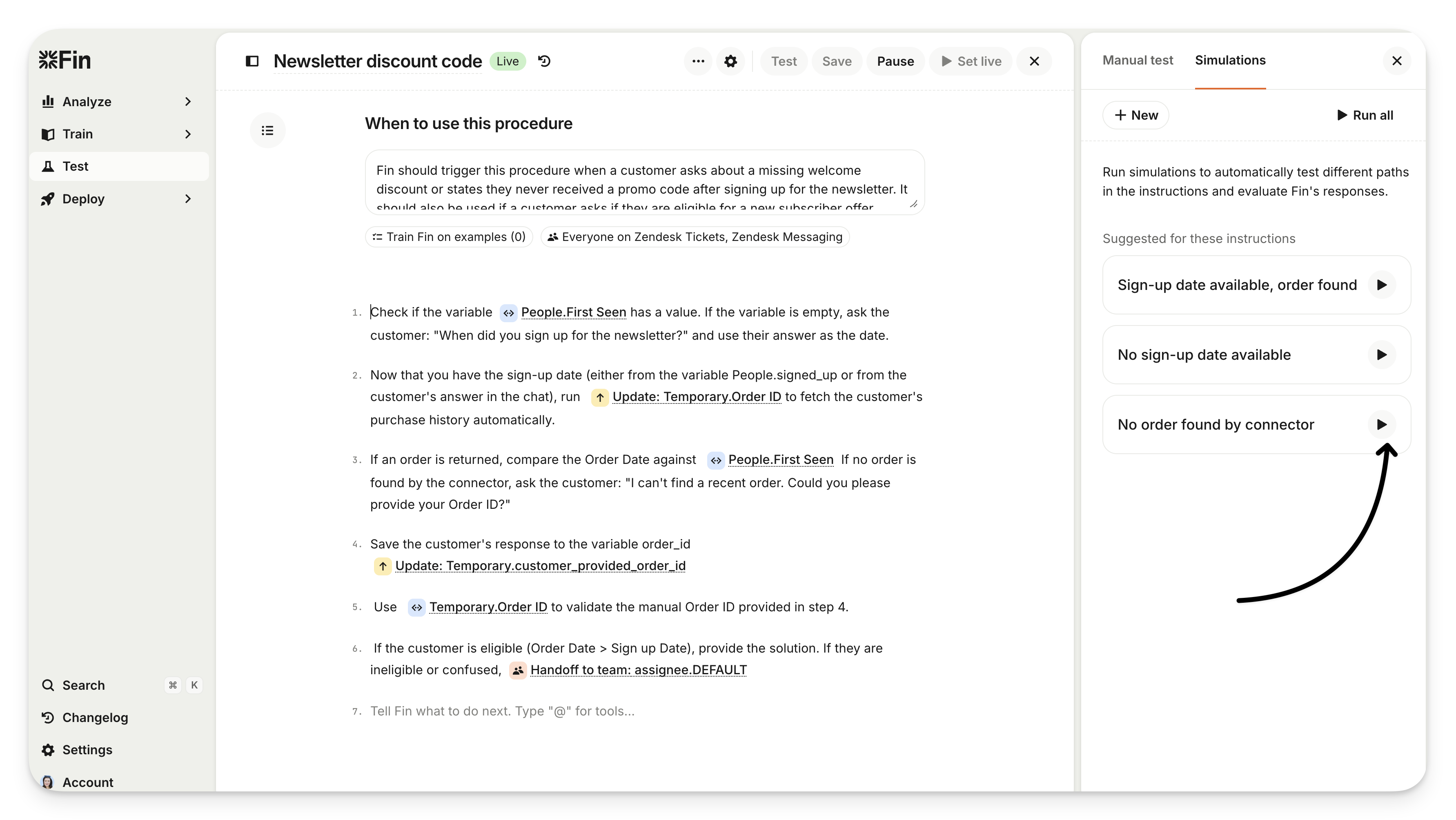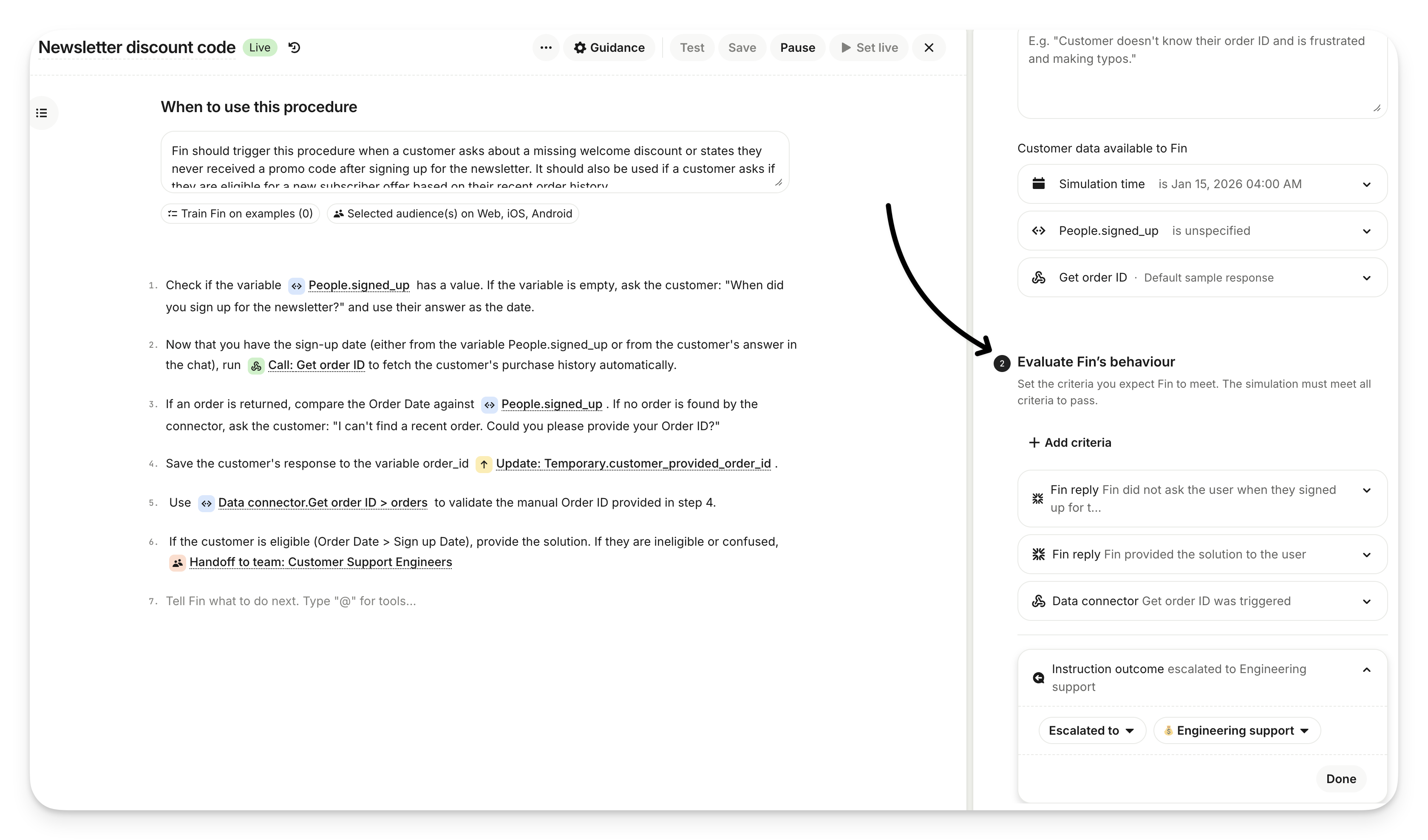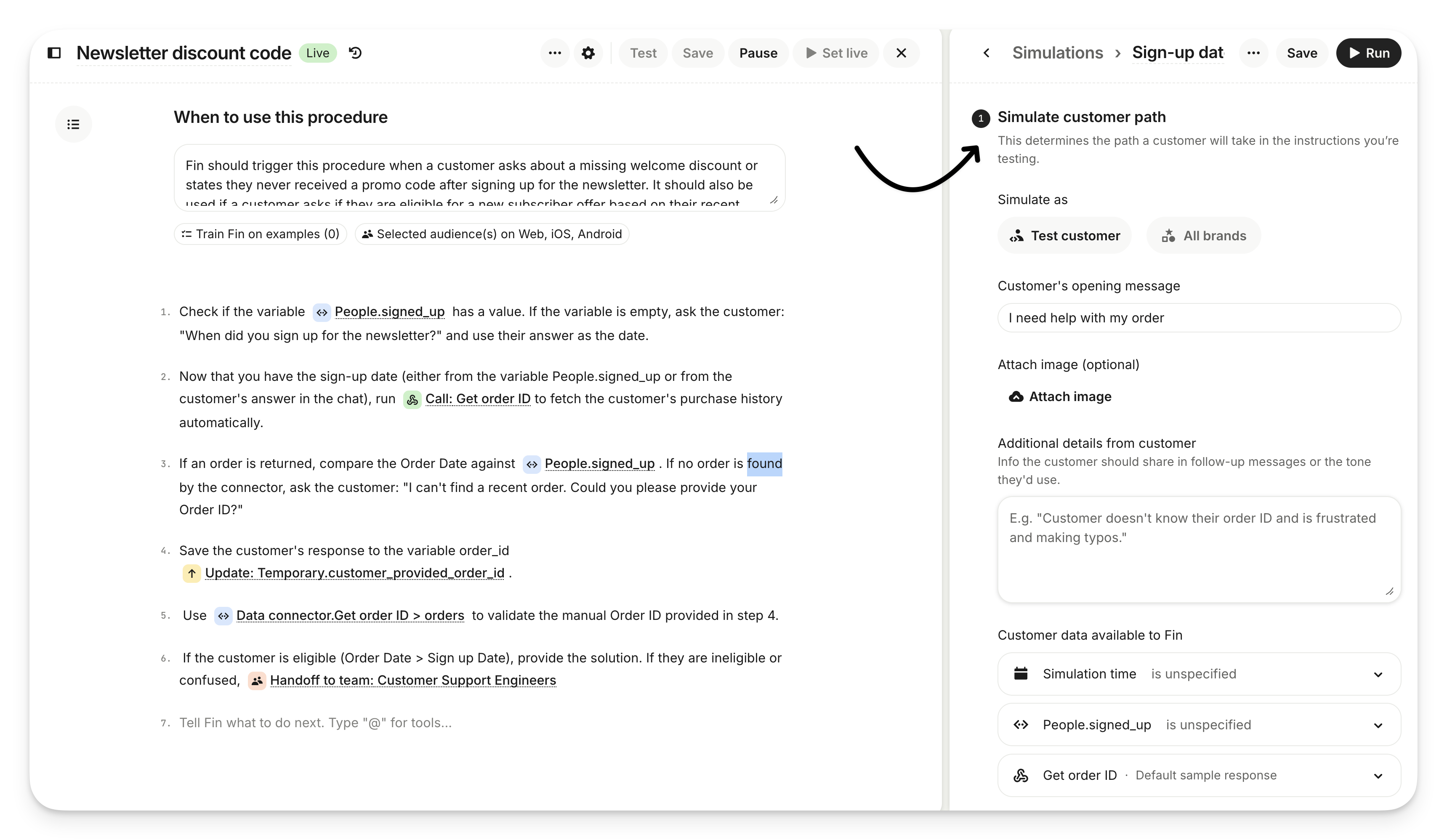 You can review the full simulated conversation to understand why Sweo didn’t behave as expected, adjust your Procedure, and re-run the Simulation with no impact to customers.