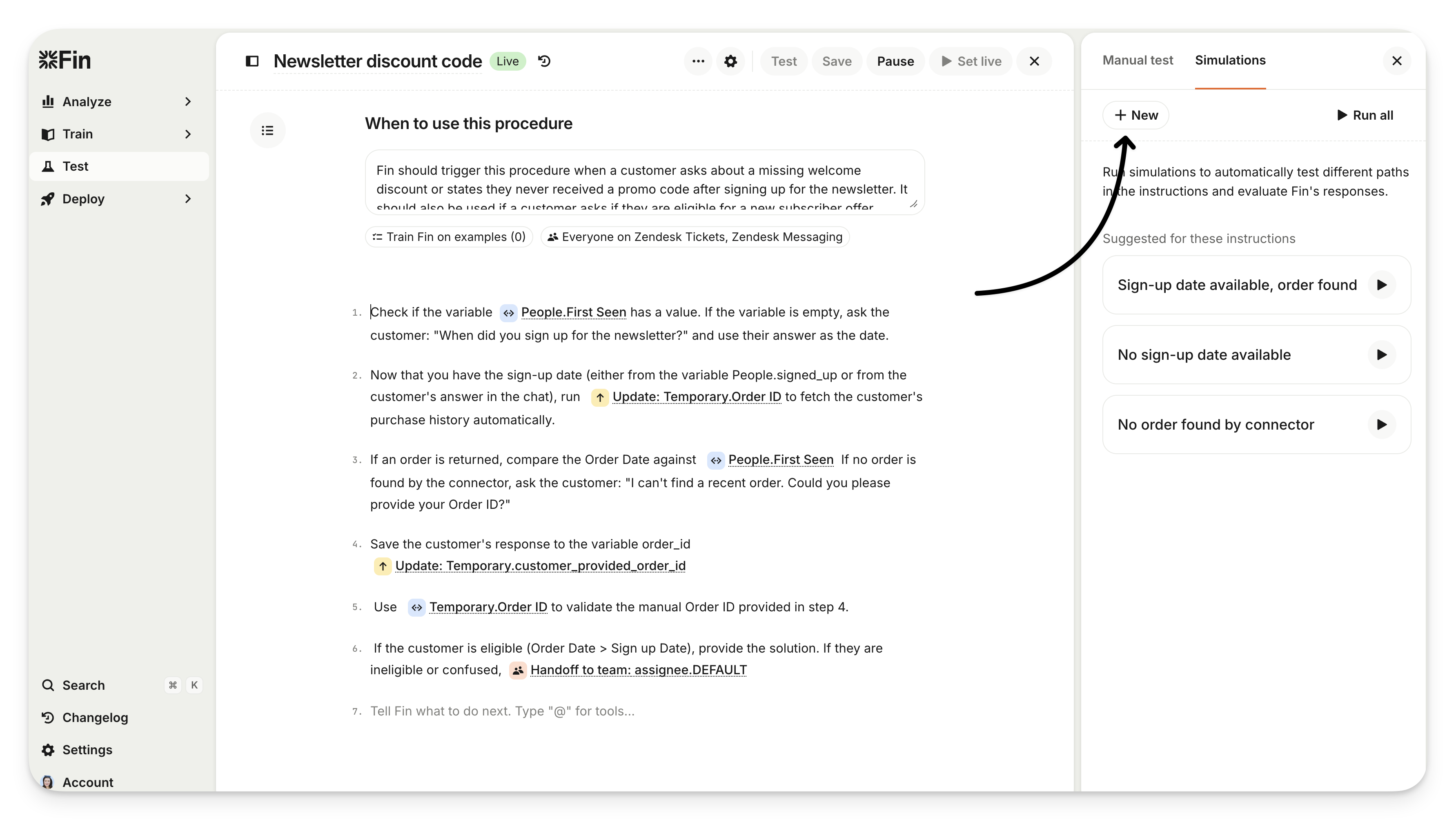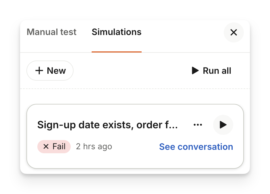AI-generated simulations: Use these to quickly cover common or expected customer scenarios based on your instructions. Sweo AI generates "ready-made" starter tests to save you time.