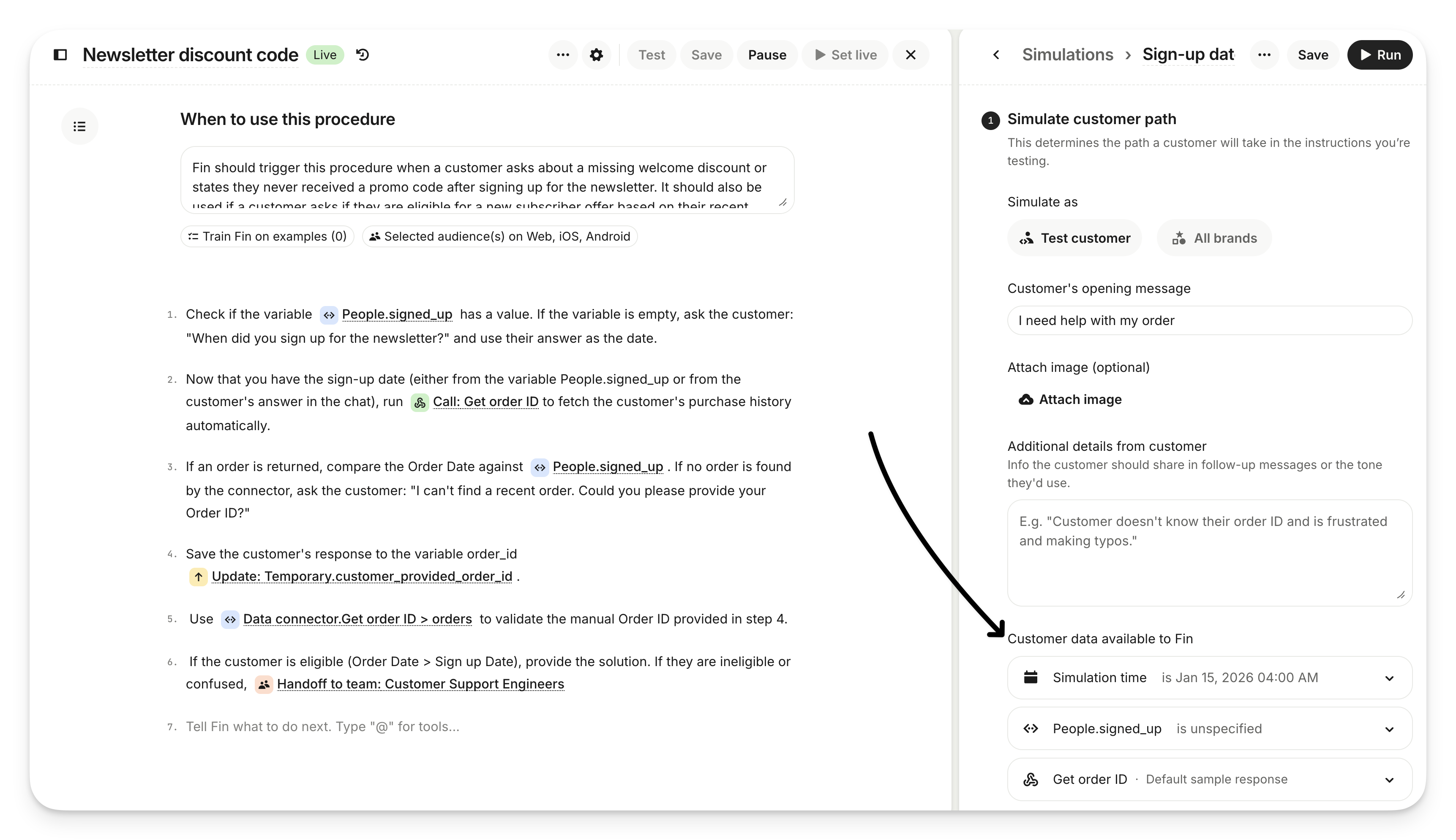 Simulation time: Use this to define "when" the scenario is happening. Setting a specific date and time allows you to test time-sensitive logic, such as checking if a customer is within a 30-day refund window.